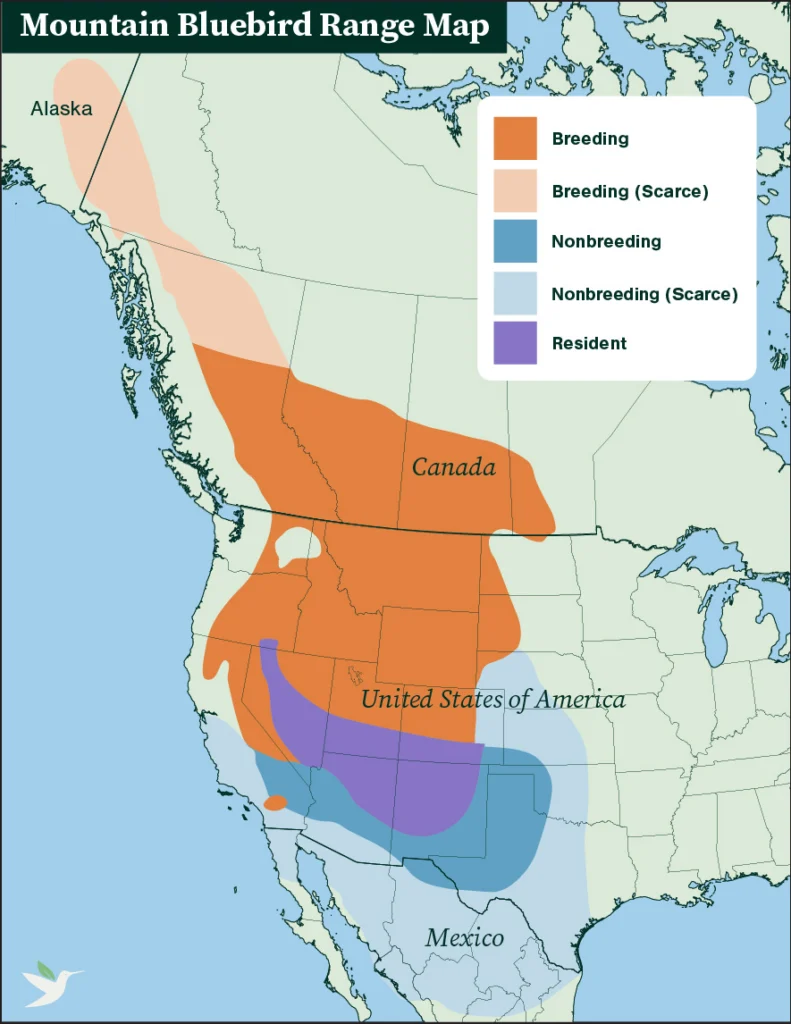 The Mountain Bluebird breeds in montane meadows and parkland as far north as Alaska, and south through Western Canada and the United States into Arizona and New Mexico. After the breeding season, birds will move further into Arizona and New Mexico as well as Texas, and sometimes into coastal California, northern Mexico, and eastward into the southern Midwest states.
